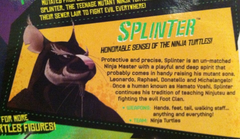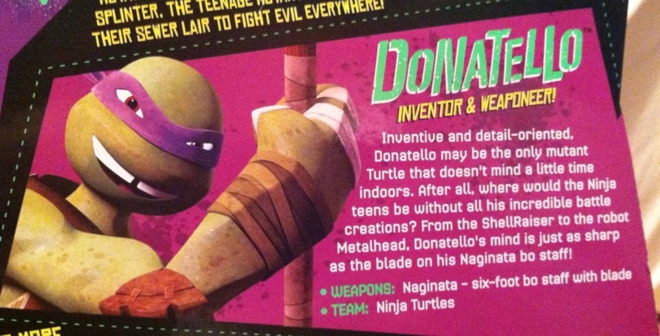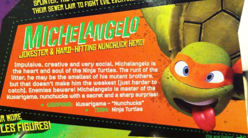 The new TMNT figures based on the 2012 Nickelodeon animated series are out…and after scouring local Toys R Us and Target stores, I’ve managed to snag the entire first wave of basic figures. Here are the profiles from the back of the cards: