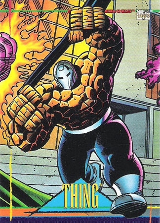 Outside of these cards, I’d nearly forgotten the “scarred Thing” phase, where Wolverine carved up Ben’s face a bit. I don’t recall how that subplot ever resolved, but obviously it did as Thing didn’t sport the fully-covered face bit for all that long.
