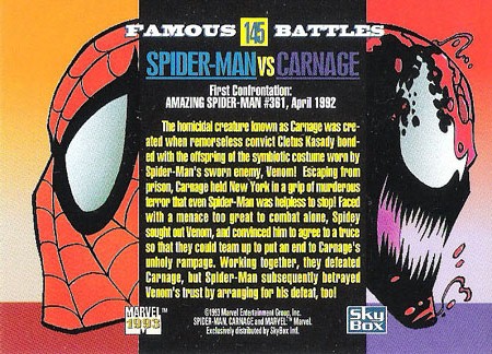 I think of these nine, my favorite cards are the Spider-Man vs. Carnage, Cable vs. Stryve, Wolverine vs. Sabretooth, and Spider-Man vs. Venom.
