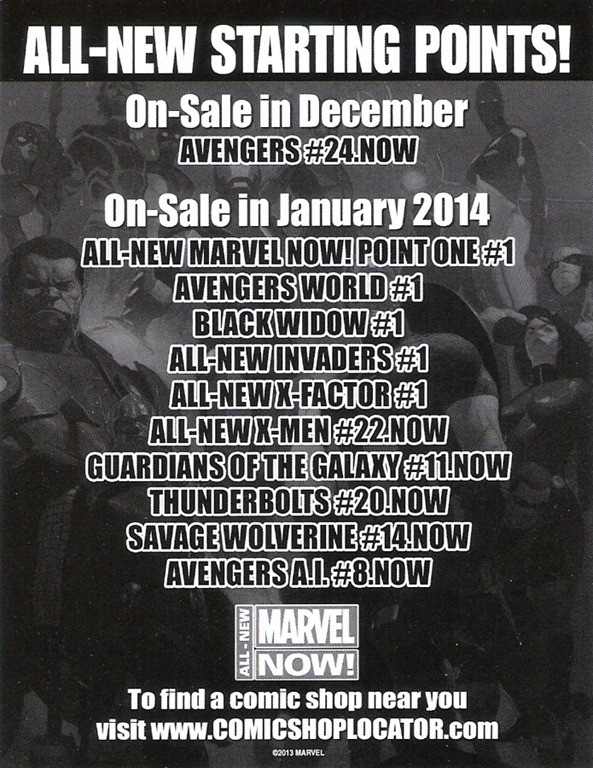 Filed under: Checklists, NON-REVIEW CONTENT | Tagged: .Now, all new marvel now, All New X-Men, All-New Invaders, All-New Marvel Now Point One, All-New X-Factor, avengers a.i., Avengers World, Black Widow, Guardians of the Galaxy, Invaders, MARVEL, Marvel Comics, Marvel Now, Point One, Savage Wolverine, Thunderbolts, X-Factor |