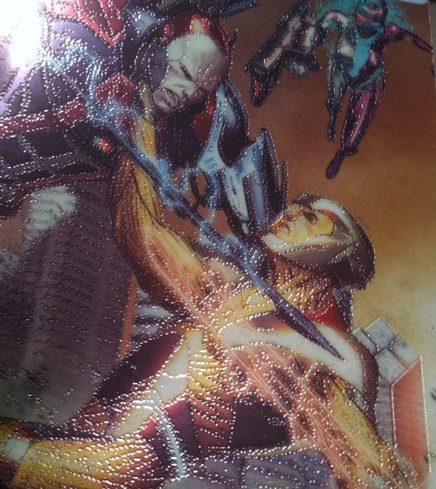 To me, part of what made chromium covers what they are was being able to see the outlines on the inside/back of the cover. Armor Hunters does have that effect, so unlike Marvel‘s Age of Ultron #1 last year, I can’t really “disqualify” it from my own personal “chromium collection.” But the muted coloring/subdued tones, the “flat” reflectiveness, and the thicker cover stock of Armor Hunters leaves me truly disappointed, and planning on sticking with the regular covers from here on out.