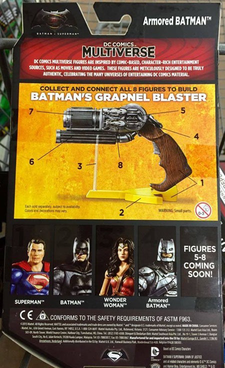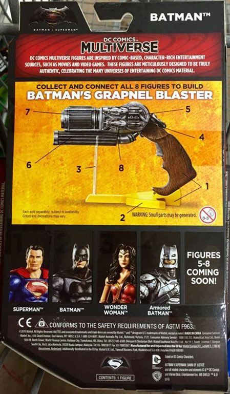 The back shows us that rather than a “build-a-figure” (say, an extra-sized Doomsday?) instead it’ll take EIGHT (presumably $20) figures to get pieces to assemble…a display prop of Batman’s grapnel blaster gun.