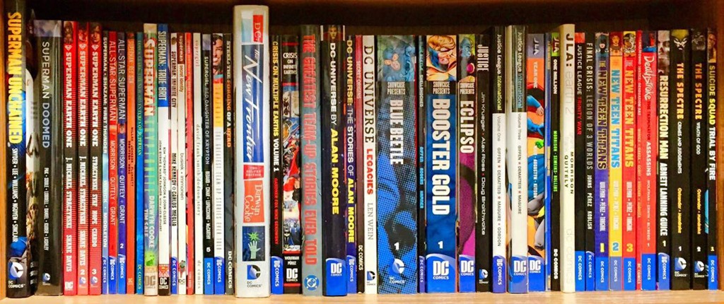 Spilling onto a third shelf, my two Superman hardcovers from the New 52 era–Unchained and Superman: Doomed. From there, the Earth One volumes, All-Star Superman, and other semi-isolated volumes into Supergirl and Superboy stuff, before getting into general-DC Universe stuff.