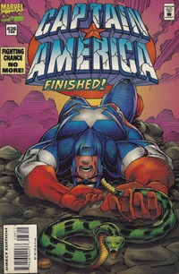 This issue sees Cap being spit out of some drainage pipe that he was apparently dumped into in the previous issue…pursued by Cobra and Hyde. We get some exposition (super soldier serum killing him, Cap’s under doctor’s orders not to exert himself, he’s thoroughly exerting himself anyway, blah blah blah). Even with his body betraying him, he manages to avoid being killed by the two villains…but at great personal cost. By the end of the issue, he’s pushed himself too far, and with ghostly images of the Statue of Liberty and then-thought-to-be-dead-but not-really-though-we-wouldn’t-find-that-out-for-another-20-years-when-Brubaker-does-The–Winter–Soldier-story Bucky flashing before him, Steve seems to lose his battle…he’s paralyzed, a mind trapped in a worthless body.