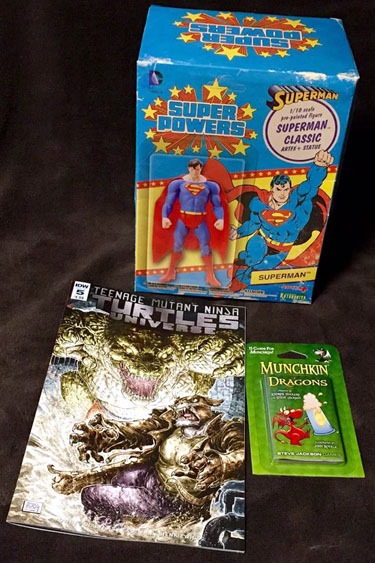 With a 20%-off-everything-but-brand-new-comics sale going on, I snagged the Munchkin mini-expansion Dragons (to go with Dragon’s Trike that I got several weeks ago)β¦and got the Super Powers Superman figure/"statue" to go with the Robin one I got several months ago (though now I definitely want Batman. And Flash. And perhaps even Green Lanternβ¦)