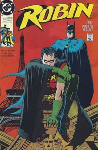 robin001_posterThe art is quite good, and rather iconic to me. Looking at this, it just screams "early Tim/Robin" to me. The cover isn’t horrible…but the way Robin’s face is, this has gotta be one of the creepiest-looking Robins I can think of! The costume, cape, etc work…but the face just doesn’t fit Tim. I also like that the "corner art" seems to be a carryover from what I recall offhand of the main Batman issues, cementing this as what it is–its own thing, starring Batman’s sidekick, but in a solo title that does NOT emphasize Batman.