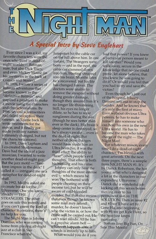 We had this introduction to The Night Man, by Steve Englehart; it also included several pages from The Night Man #1; but as they were simply pages from the issue and I already covered the issue itself, and I haven’t been putting story pages in these posts, I’ve opted to simply present the introduction as it’s the unique content.