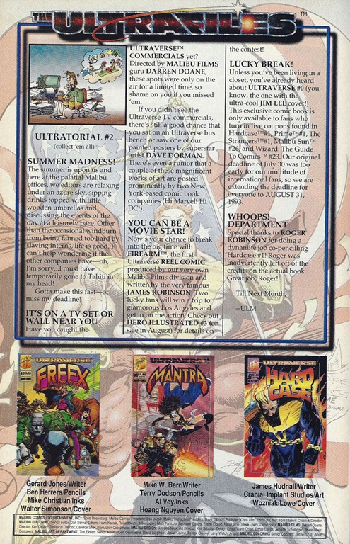 Here are house ads from the second month of the Ultraverse line: July 1993! We have two with dates, one without…and then the "Ultrafiles" pages which were all the same this month across all five titles.