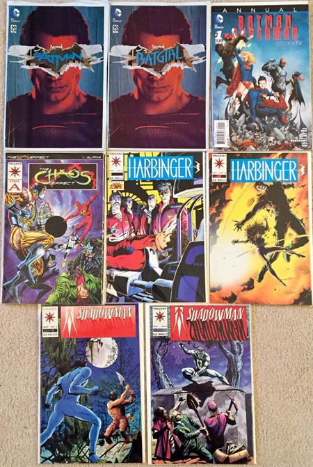 $1 each for "recent" New 52 issues with $5.99 and $4.99 cover prices is not bad. I didn’t buy into the blind-polybag-cover crap for the #50s at the time…but for $1, snagged Batman #50 and Batgirl #50; neither of which I owned before Sunday, offhand. And knowing I’ll eventually be wanting to fill in the ancillary Superman titles (Superman/Wonder Woman, Superman/Batman, Batman/Superman, etc.) snagged the first Batman/Superman Annual. I also snagged several "classic" ’90s Valiant issues that I think I probably already own, but they’re still in my phone as ones I was looking for, so I figured I’d get ’em just to be sure.