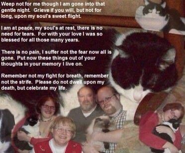 After we lost Christy, I found this poem–Weep Not For Me–by Constance Jenkins, and it REALLY hit me…and along with Dewey: The Small-Town Library Cat Who Touched the World, helped me process my grief after losing Christy. And it has been something I’ve tried to have with Kayla, and with Ziggy.