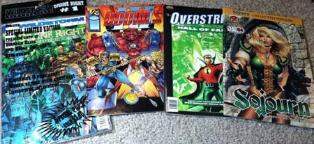 The polybag on Divine Right caught my attention…but moreso is the “preview” issue for Stormwatch. Doom’s caught my attention as a mail-away. Overstreet looked interesting–rather than a price guide it’s got short creator profiles. And the Sojourn issue is Sojourn; an apparent one-shot or such. Originally $3.95 cover price…not a bad buy from the bargain bin.