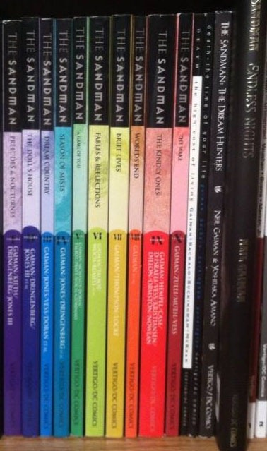 mysandmanlibrarySo, the new Sandman series, Overture, premieres tomorrow. First issue of five or so, I believe, shipping bi-monthly. Which means almost a year of new Sandman comics, albeit ~8 weeks between issues instead of 4 (or in the case of ridiculously over-shipped Marvel titles, 2ish).