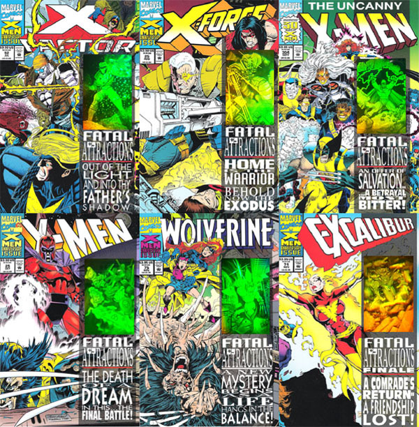 I’m most used to seeing the front half of this cover, so I’m that much more impressed opening the issue and looking at the whole of the image. The trade dress for this series is the darkened overlay on the right-hand side with the Fatal Attractions logo, cover blurb/title, and of course the hologram. This overlay takes up nearly half of the front cover and for me has always been the dominant factor. The hologram image itself is about the size of a trading card, and even now remains quite impressive to me–I recall noticing how “deep” the image was, and in the right light I can still stare at it for a bit, marveling at the detail and depth. (Even with contemporary 3-D films, I’m far more impressed by the depth of purported 3-D than I am stuff popping out at me).