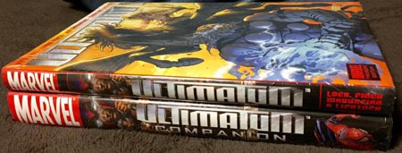 The main Ultimatum volume has Ultimates 3 and Ultimatum itself…unfortunately, does not have the Annuals that were collected in the March on Ultimatum regular-sized hardcover. The Ultimatum Companion includes tie-in issues in the run-up to, during, and after the event for Ultimate Spider-Man, Ultimate X-Men, and Ultimate Fantastic Four; it also includes the Requiem issues for those titles.