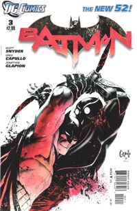 batman003I still can’t get over how great it is to see that Bruce Wayne–the man UNDER the Batman cowl–is actually being treated as a useable, viable character again. After so many years of being a virtual non-character, here we see that yeah, Batman is a huge part of him…but there’s still SOMETHING to Bruce Wayne. And his life AS Bruce Wayne, as a Wayne, plays into his life as Batman. This issue sees Bruce/Batman learn more about whatever this stuff going on with the Owl imagery is, including a costume that (well ahead of me reading this issue, I saw over at Bleeding Cool with that site’s comment on the costume being obviously like Owlman from Watchmen) I agree would have at least put me in mind of Watchmen, though having it spoiled I don’t feel like going to actually look up the comparison. I like the dynamic between Bruce and Alfred…Snyder definitely has a good feel for this character, and builds a story that doesn’t feel like I turn two pages and find a to-be-continued. There’s more substance here, it seems, than a lot of other comics…though this still feels rather short. At least the issue is only $2.99, and does NOT include one of those stupid 5-7 page “previews.” The art continues to also be quite good…and I’m coming to very much enjoy Capullo‘s take on these characters. I was curious if this week’s issue would change my mind at all, but this issue keeps me interested enough that Batman will survive a likely culling of my already-limited pull-list in the coming weeks. (8.5/10)