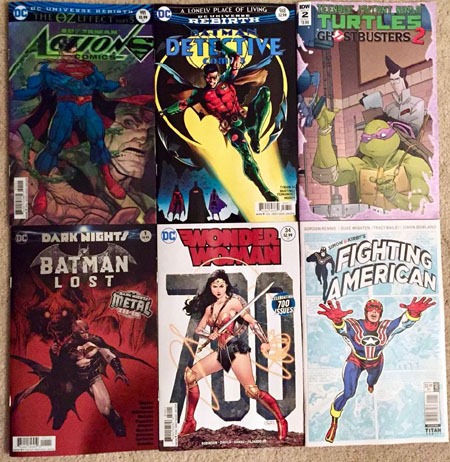 The latest Metal one-shot/special/tie-in, and the new issue of Fighting American. And since I’d bought the "#800" variant of Superman #34, figured this Wonder Woman one would be a nifty match (I hope whatever Batman one will be as easy to get!).