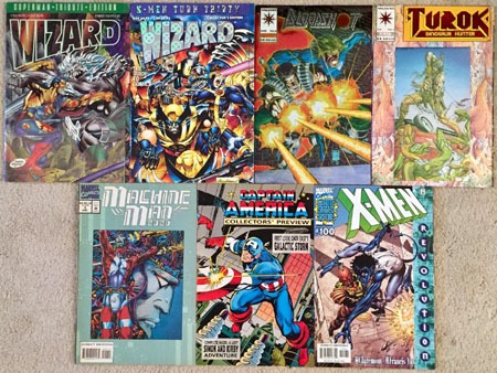 I hit a significant quarter-bin jackpot on Good Friday (likely detailing that in an upcoming post). This past weekend, I found less of particular interest, despite snagging a "grail" (also in the likely-upcoming post). But for $1.75…two Wizard specials ($4.95 apiece cover price, I believe), the "chromium"/fancy covers for Bloodshot #0 and Turok #1 (another $8ish between the two), a Machine Man issue (that I mistook as some sort of 2099 special I’d missed all these years), and oversized Captain America (with stuff about Galactic Storm) and one of the number of variants from 2000’s X-Men #100. Easily $30ish in "value" for $1.75. Far superior value over even one $5 contemporary Marvel issue.