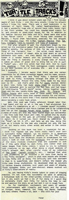 In both the Donatello issue and an issue I recently read of The Savage Dragon, I found pieces by Peter Laird and Erik Larsen about the man, that seem appropriate to share below. Laird‘s piece is from 1986 while he was still alive; Larsen‘s is from just after Kirby‘s passing. Both put things far better than I could, and show some of the influence he had just on these creators and their properties..!