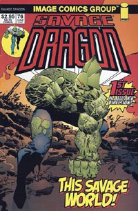 savage_dragon_0076More recently, I’d noticed or mentally connected Erik Larsen‘s Savage Dragon stuff to him, Larsen having a Kirby-esque style at points, and what seems to me a definite visual influence. Said influence was “confirmed” for me, reading Larsen‘s intro to the Savage Dragon: This Savage World collected edition.
