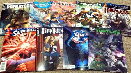 New Action Comics from this week; TMNT #63 from last week or the week before, with TMNT Universe from this week. The Aliens: Life and Death issue is from some time back, while Aliens: Defiance is from this week. I’m not certain if Letter 44 and the IDW Greatest Hits: Godzilla are from this week or not.