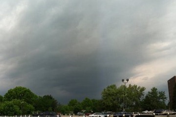 Roommate and I were heading to the stairs to come back up but wound up stopping to be part of the congregation in the hall by the side entrance of the building–had some conflicting “news” about stuff from people coming in, so stuck around to hear stuff. Someone said some tower nearby fell, another mentioned a tree down on a main road nearby, etc. Adding some levity to the situation, my roommate and I both realized that the weather.com info then-presently available for our mobile devices showed 69-75 degrees sunny and “partly cloudy” (as we listened to the latest round of the emergency siren sounding all around, the rain drilling to the ground from the dark clouds, and a lengthy strip of lightning burning in the distance).