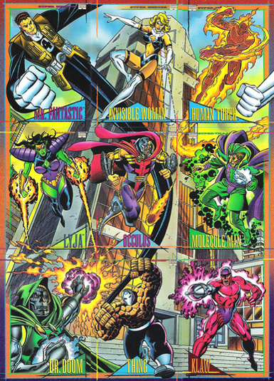 This is another “busy” image, though a bit brighter. Mr. Fantastic, Invisible Woman, and Lyja certainly sport the ’90s “look,” with the jacket, giant shoulder pads, and…needless “cleavage hole” for Sue.