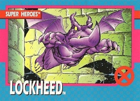 I’d swear I’ve seen images of Lockheed on Kitty Pryde’s shoulder like a parrot…but 55 lbs? That definitely stretches stuff a bit. I don’t remember much detail of the character over the years, but this card’s info doesn’t seem to be contradictory to anything…just a bit outta date. And I knew how he got his name, but forgot til re-reading the card. I probably knew that originally from this card. Or Wikipedia.
