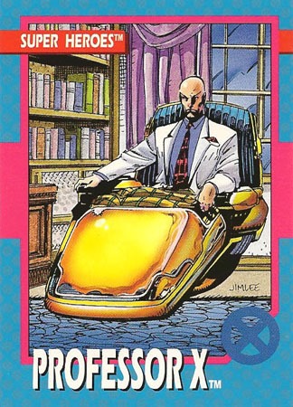 Given Xavier’s place in the X-Men story, I’m surprised he wasn’t the first card…but then, they’re not going alphabetically nor in order of first appearance and not even by team, so…yeah. This is a fairly typical image of the character, and though I have fond memories of the look (with the golden hover-chair) it seems so dated now, afer getting used to the character in actual wheelchairs or with his legs restored.