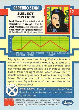 Nothing stands out much for this card (though I’m noticing the weights of characters seems rather questionable). Her "X-tra Fact" is something I don’t think I’d consciously realized until a recent-ish Nightcrawler series. I have the feeling by the time I’m done offering commentary on this series of cards, I’m gonna be thoroughly kicking myself for not (yet) having gotten to the bulk of the Claremont run.