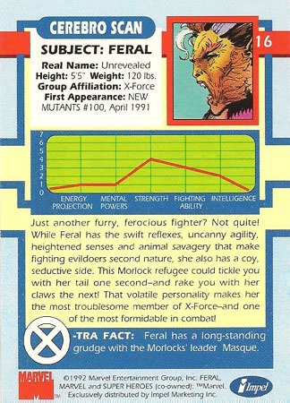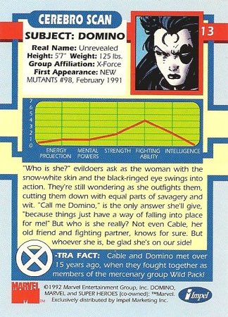 This card pretty much sums up what I’d be able to say about the character, despite remembering her from those issues of Cable. And I would not have been able to cite her first appearance or tell you offhand that she’d first appeared in New Mutants #98. This description seems "typical ’90s," as is fitting.
