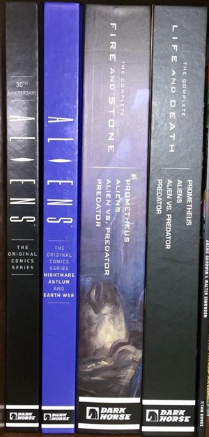 Of course, there are the comics–which I have in multiple formats. I’m loving the oversized hardcovers. There are the original collected volumes. We recently got a collection of Dark Horse‘s collaborations with DC on the Aliens stuff. The excellent Omnibus series encompassing Aliens, Aliens vs. Predator, and Predator itself.