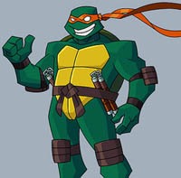 Michelangelo: I don’t care for the prominent kneepads in the promo image, nor that he basically seems to have some kind of bladed ball attached to a stick…another "replacement" weapon; a factor I’m not keen on. The kneepads seem odd to me in a way I can’t quite place…like they’re more for skateboarding or such than the kneepads/wraps of previous versions of the turtles.