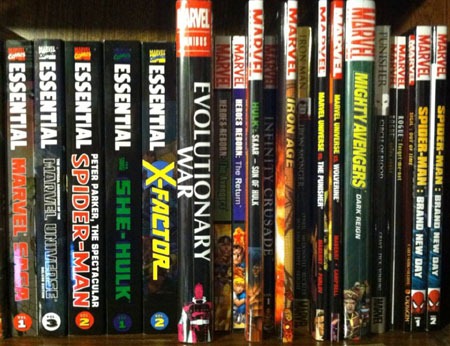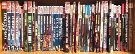 I went with a quasi-alphabetical scheme, “grouping” stuff like Avengers, Captain America, Essentials, Spider-Man, Ultimate Universe, X-Men, and such with other stuff peppered throughout. Within these groups I put stuff mainly in story order or in the case of numbered volumes, numerical order with the entire cluster roughly where they’d begin in-story (with a few exceptions for appearances).