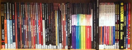 Hellblazer, Sandman, and Y: The Last Man headline my Vertigo shelf. I do want to “upgrade” my Hellblazer volumes to the newer printings for the early stuff, except I think vol. 2 is already out of print while 1 and 3-5 may not be? I may also “downgrade” the All His Engines to the softcover just to “fit in” more. I’m looking at doing the same with the Sandman: Endless Nights volume. Watchmen sits alone without any Before Watchmen as it’s physically smaller and if I’m to ‘buy into” the Before Watchmen stuff, I want it to physically match with the original.