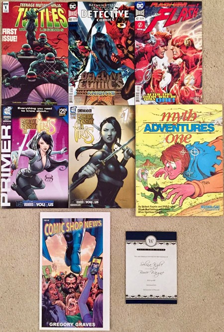 And though I’d seen it last week, I passed on Myth Adventures One. But having the week to consider, and this week being a smaller week, for the price of  2 1/2 standard-price comics, I got this graphic novel edition–33ish years old–collecting the first four issues (and in color!) of Myth Adventures. (And as I said regarding my purchase of the single issue #10 back in March, I must blame fellow blogger Michael Carlyle, writer of The Crapbox of Son of Cthulu firstly for “inspiration” to get that issue, and then his recommendation of the series that helped prompt this purchase). I also like that its size should be a nice match to the original TMNT color editions.