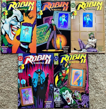 Robin II featured one of the earlier egregious use of variants that I’m aware of. Not only was there a hologram on the covers, you had different cover images…but all with the same hologram per issue! However, the quantity of covers declined with each issue. #1 had 4 hologram covers, #2 had 3, #3 had 2, and #4 just had 1. (And all 4 issues also had a newsstand edition/variant with no hologram!)