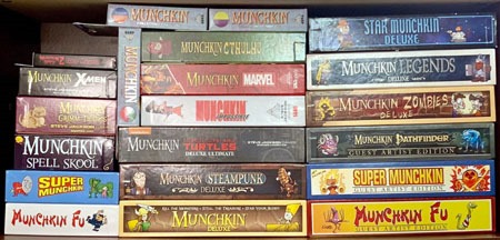 I finally got my Munchkin collection re-organized. At one point I thought I wanted to condense to a couple of their "monster box" things, but realized I’d rather just have the games obvious as to what they are, and NOT have to lug most of a collection around just to be able to play any given version.