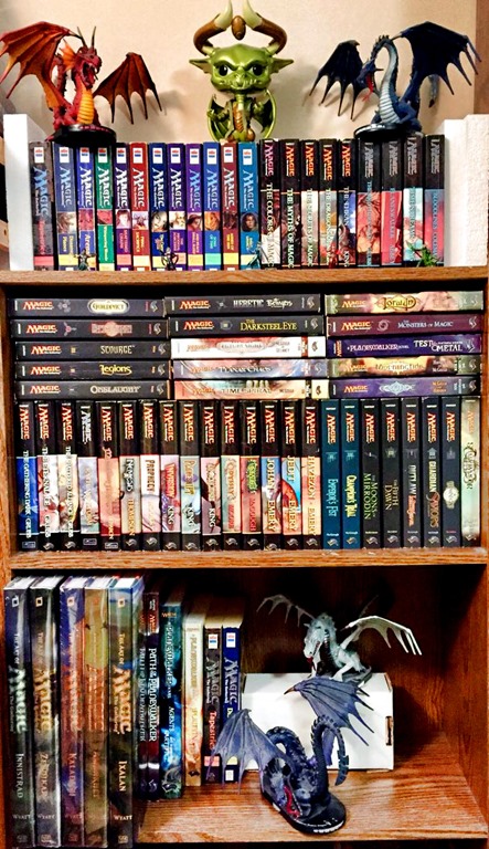 I’m a bit mixed on the art this time through. On the one hand, it’s not bad in itself, and some of the spells are certainly recognizable if one’s familiar with pre-Weatherlight Magic: the Gathering card art. Other than that it’s mostly "generic fantasy-ish" art…not horrible, but not wonderful. I appreciate the recognizability of characters and spells…but if I didn’t recall the cards and art from way back when, it’d be that much more generic overall. The "planar barge"–that is, the corpse of the Elder Dragon Chromium/Rhuell–is impressive and fairly striking throughout. That Ravidel addresses the corpse as if alive–and it blasts stuff with bolts from its mouth–is interesting, considering it IS, at this point, a corpse, though not obviously a zombie creature or such!